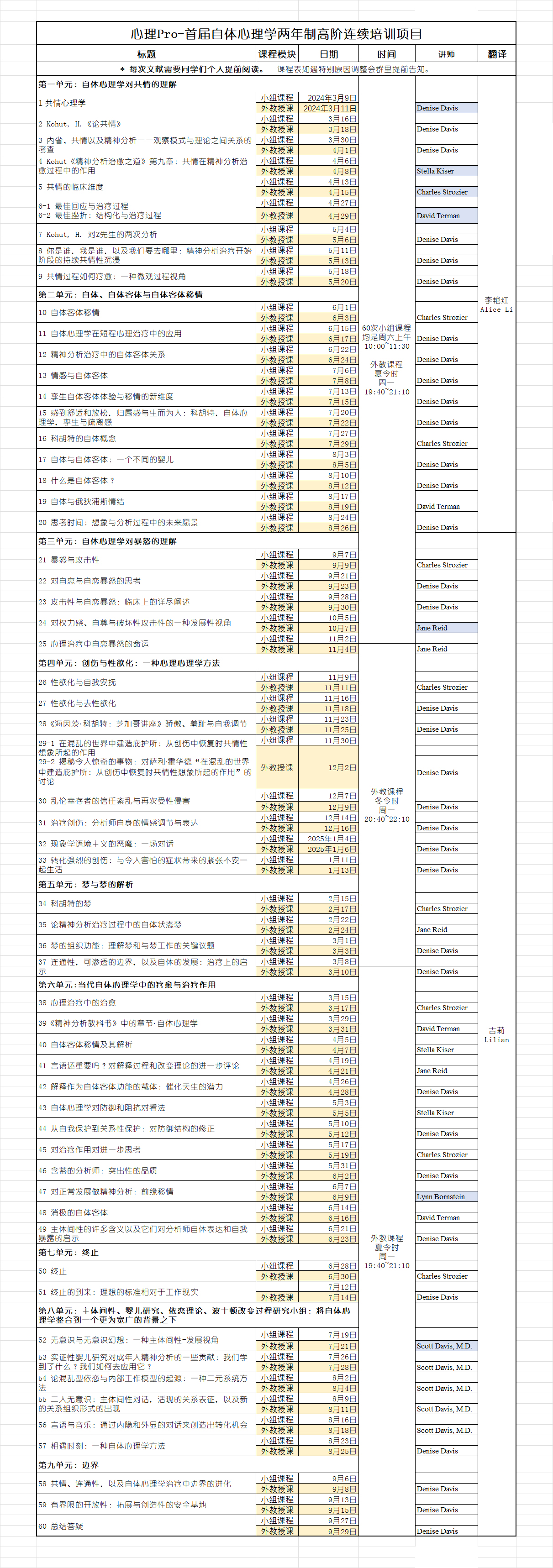 首届自体心理学两年制高阶连续培训项目课表