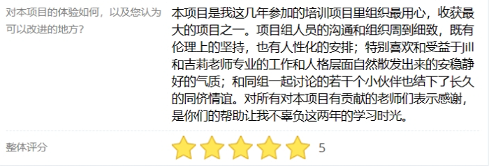 小组讨论:共21次,每两次观摩进行一次,由多位专业助教分组带领研讨案例和理论。时间为周六晚上8:10~9:10