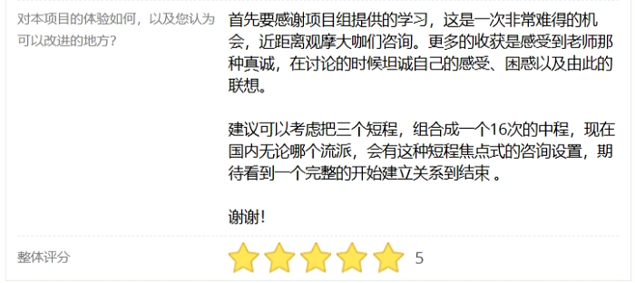 观摩课程:预计周期1年多,共42次,每次90分钟(60分钟现场咨询+30分钟答疑)